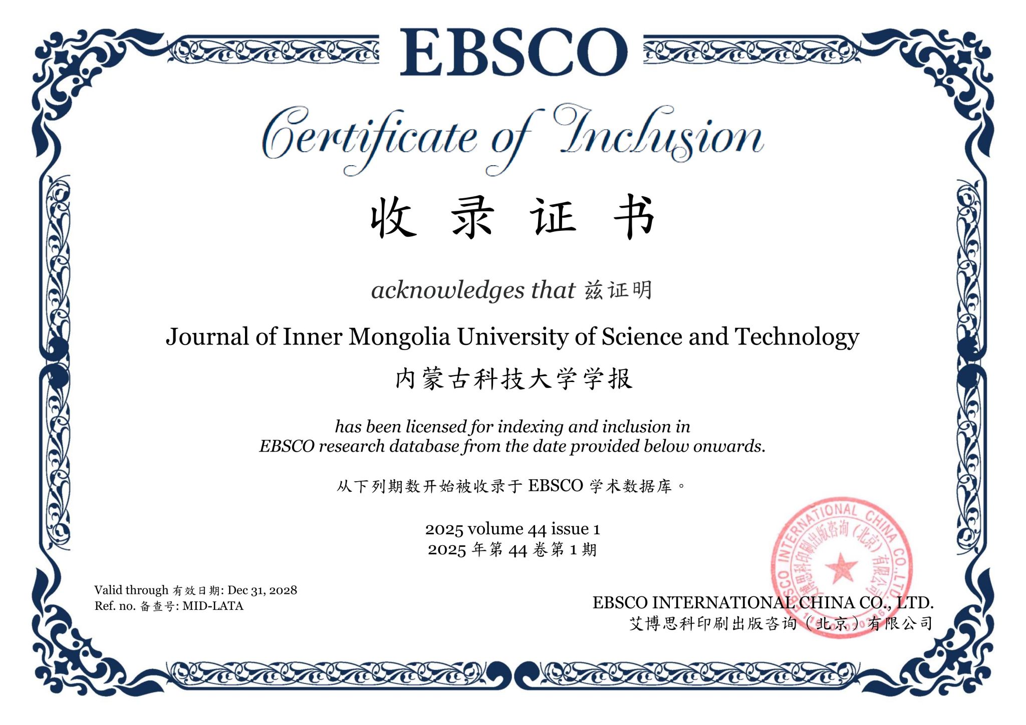 2025年10月20日,美国EBSCO公司向内蒙古科技大学发来了收录证书。标志着《内蒙古科技大学学报》(Journal of Inner Mongolia University of Science & Technology)被国际权威综合数据库EBSCO全文收录。